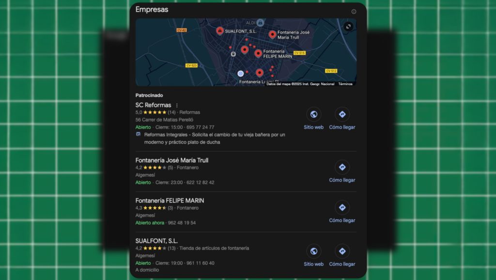Cuando alguien busca “ferretería cerca de mí”, “fontanero en mi zona” o “clínica dental [ciudad]”, Google muestra primero el mapa. Ahí es donde se toman las decisiones.
